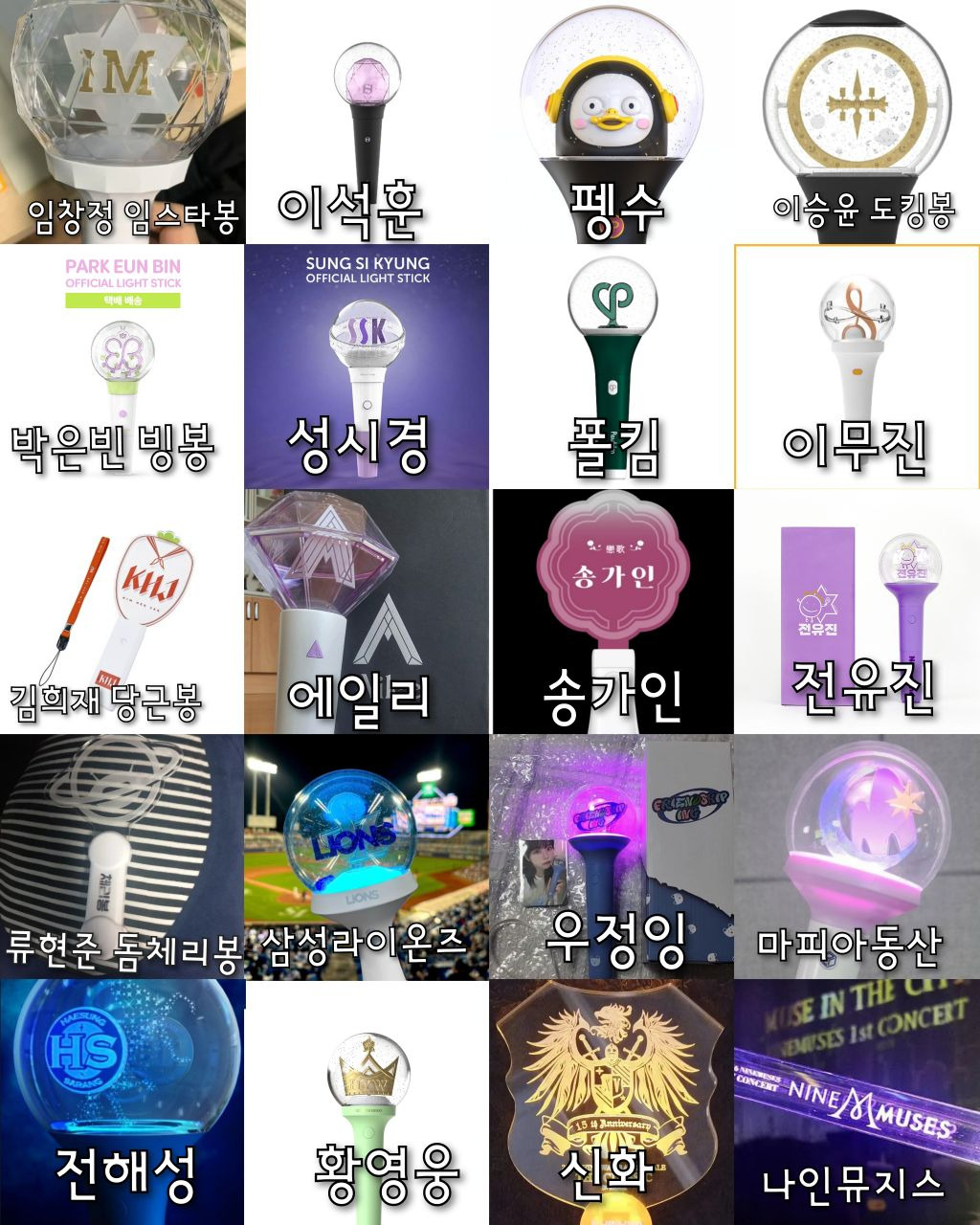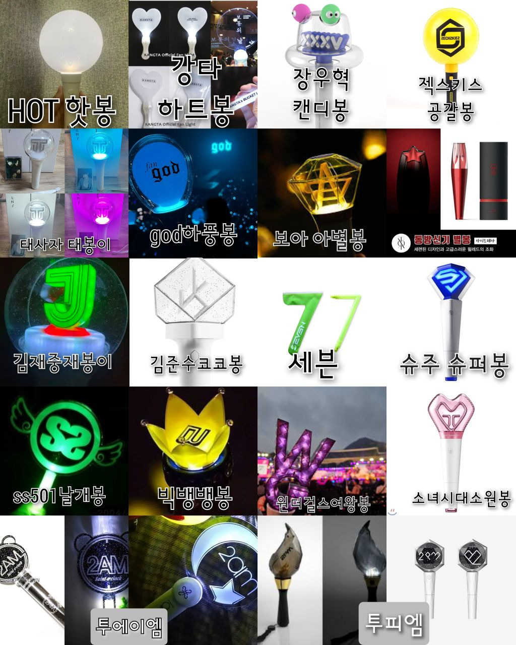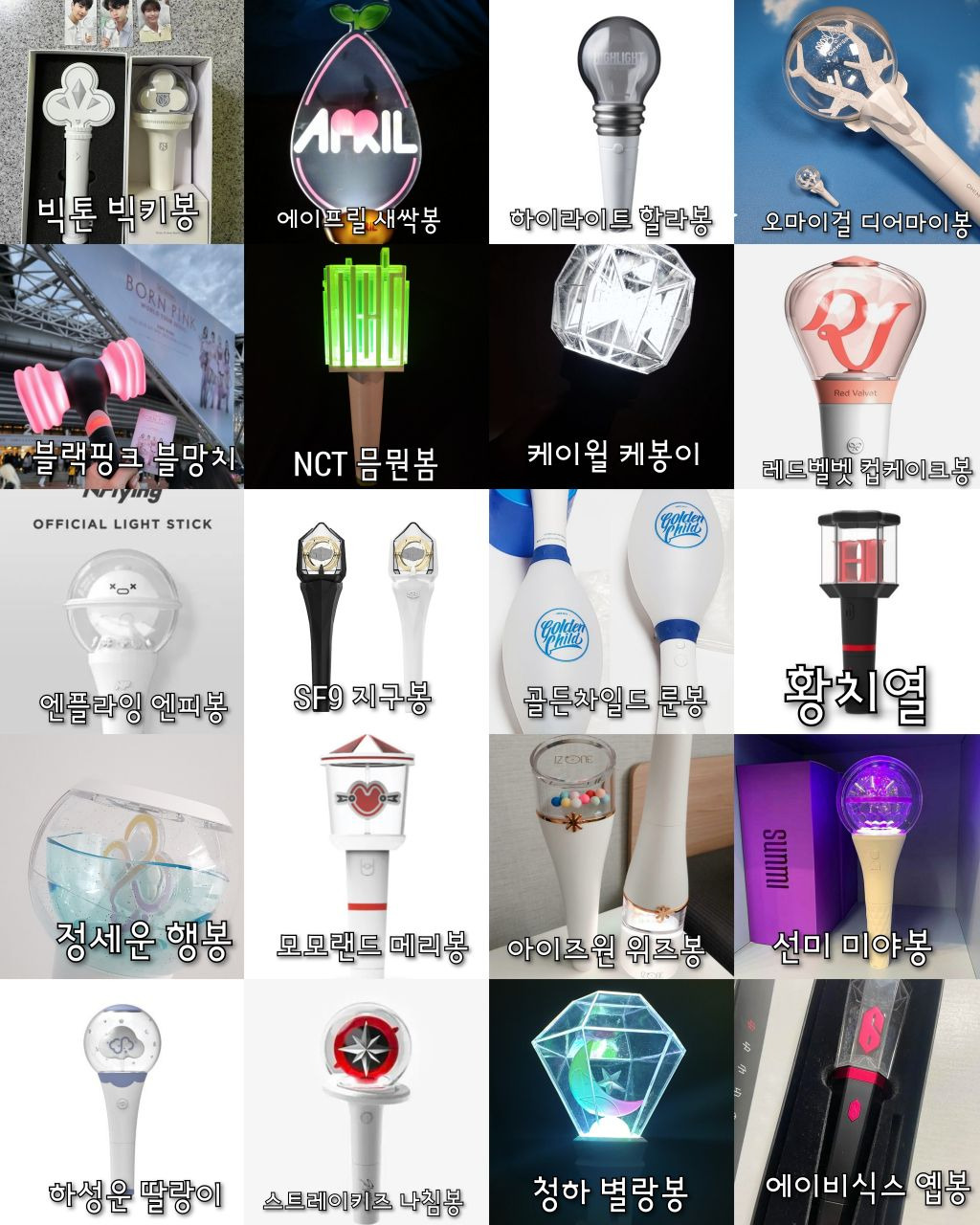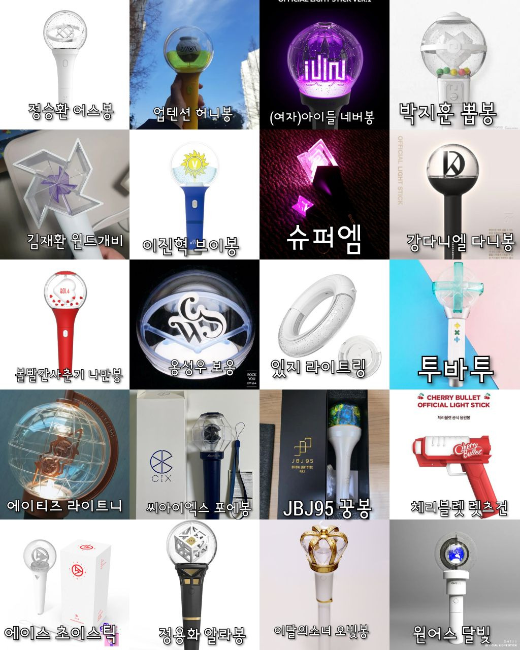 이틀동안 나무위키랑 구글검색해서아이돌 뿐 아니라 솔로가수 배우 등등있는응원봉 다 찾아보려했으나 당연히 빠진거 있을수있음!!포터스텔라X 포레스텔라O ㅠㅠ 미안..검색하고 편집하는데 오래걸렸으니까 나쁜말은 하지말아줘ㅠㅠ+김연경 응원봉
