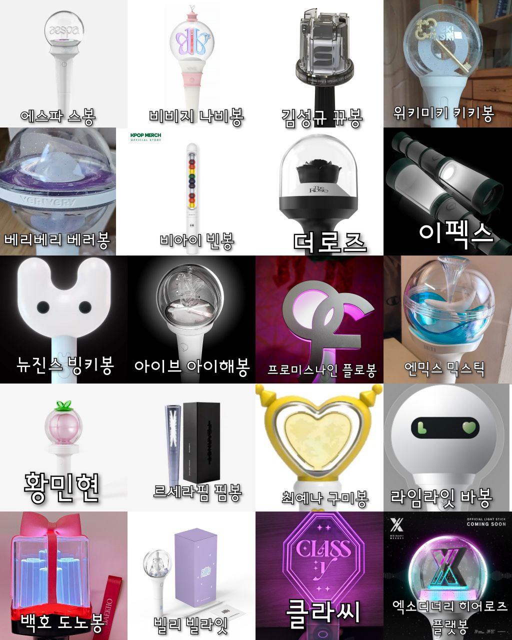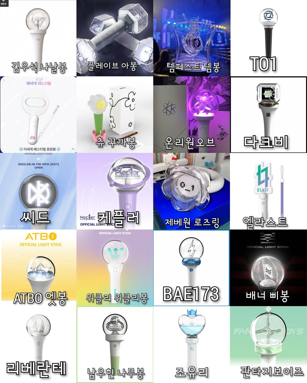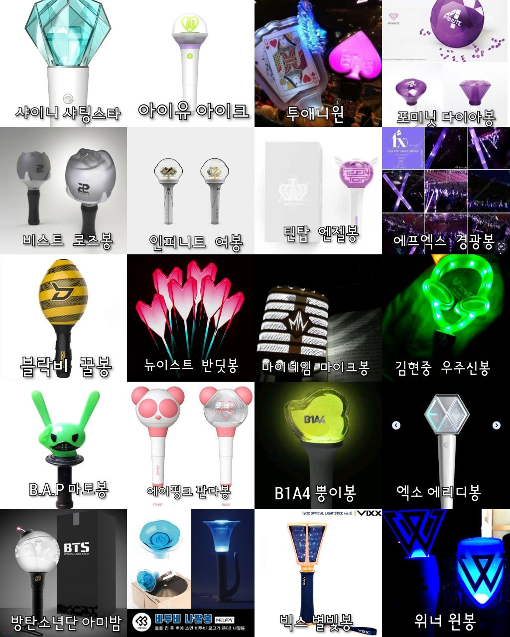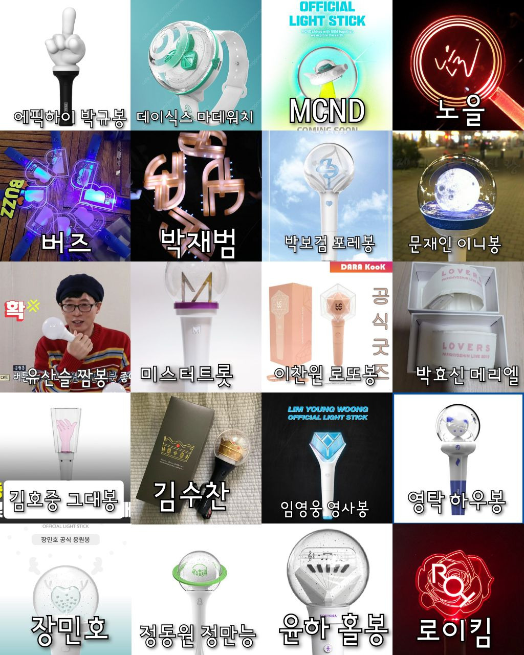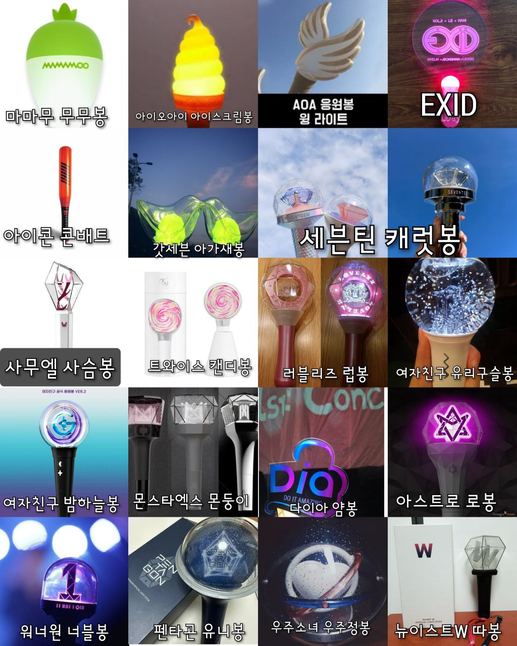이틀동안 나무위키랑 구글검색해서아이돌 뿐 아니라 솔로가수 배우 등등있는응원봉 다 찾아보려했으나 당연히 빠진거 있을수있음!!포터스텔라X 포레스텔라O ㅠㅠ 미안..검색하고 편집하는데 오래걸렸으니까 나쁜말은 하지말아줘ㅠㅠ+김연경 응원봉