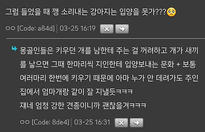 강아지 목덜미를 잡았을 때 깽! 하는 소리 안 내는 애들이 대범하다고 생각해서 그런 녀석들로 고른다고