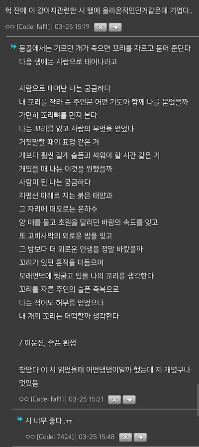 그리고 개가 수명을 다해 죽으면 인간으로 환생하라고 꼬리를 잘라 머리맡에 묻어주고