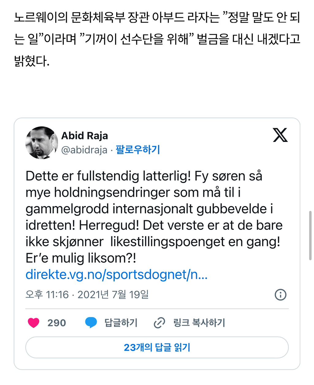 노르웨이 문화 체육부 장관도 나서서 벌금을 대신 내겠다고 함. 우리는 남성 중심의 보수적인 국제 스포츠계의 문화부터 바꿔야 한다고 말하면서..