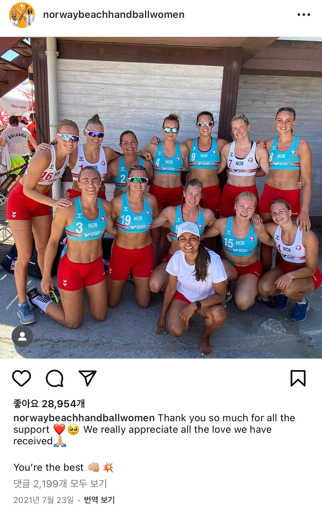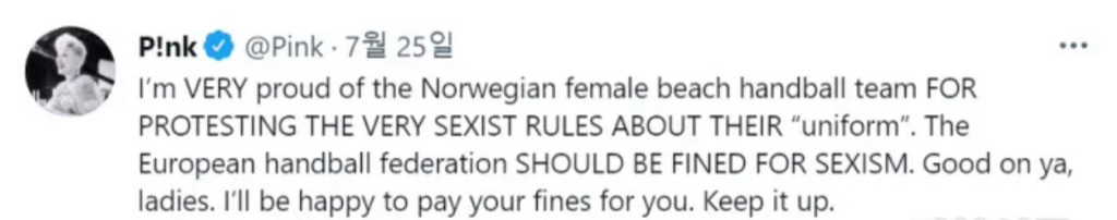 나는 노르웨이 여성 비치 핸드볼 팀이 성차별적인 유니폼 규정에 저항한 것이 자랑스러워. 성차별로 벌금을 내야 하는건 유럽 핸드볼 협회야. 잘 하고 있어 아가씨들. 내가 너희 벌금을 대신 기쁘게 낼테니 계속 해.