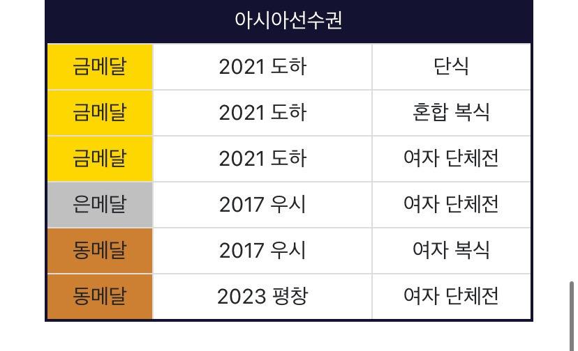 - 세계선수권 0회 (은메달이 커리어 하이임. 최근인 2023년 결승에서 쑨잉샤한테 패배)