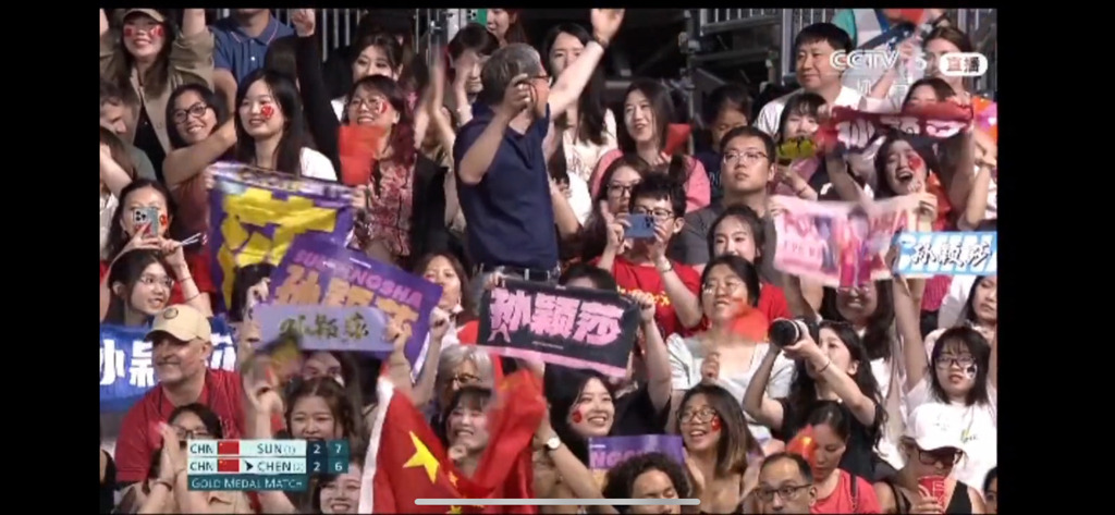 즉 관중 대다수는 쑨잉샤 개인 팬덤이었고, 저 사람들의 목적도 쑨잉샤 응원이었음. 쑨잉샤가 금메달 따면 그랜드슬램이어서...애초에 중국 응원하러 온 사람들이 아니라 오로지 쑨잉샤 응원해주러 온 팬들이었던 거 (그랜드슬램에 대해서는 아래에 설명하겠음)