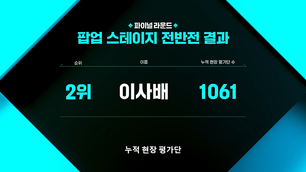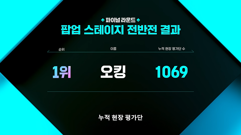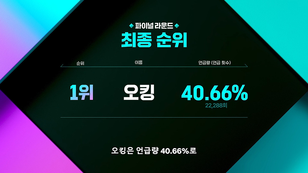 후반부(최종 우승)도 오킹이 1위였지만, 2위인 이사배랑 고작 2.89% 차이 밖에 안났음 ㅠ...