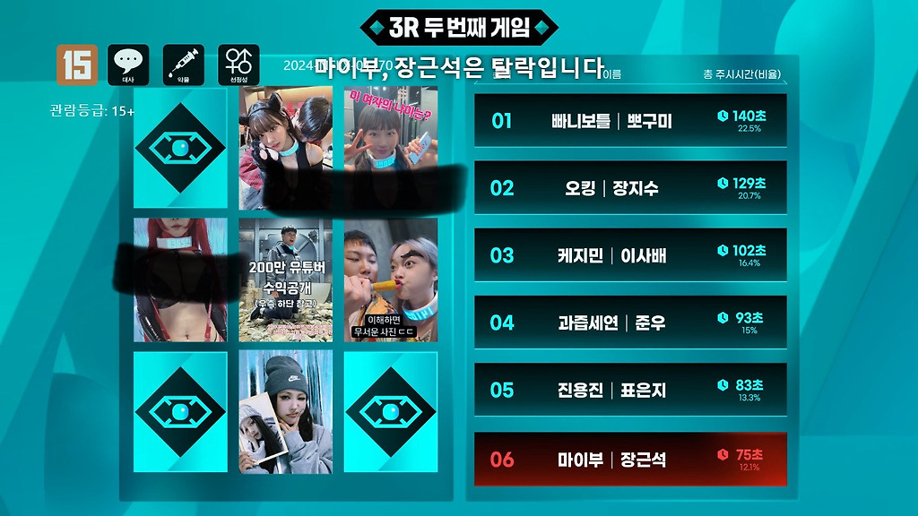 여 출연자들은 헐벗고 섹시댄스 추고 난리 부르스 추면서 안정권 안에 들면서 빠르게 일찍 생존함.