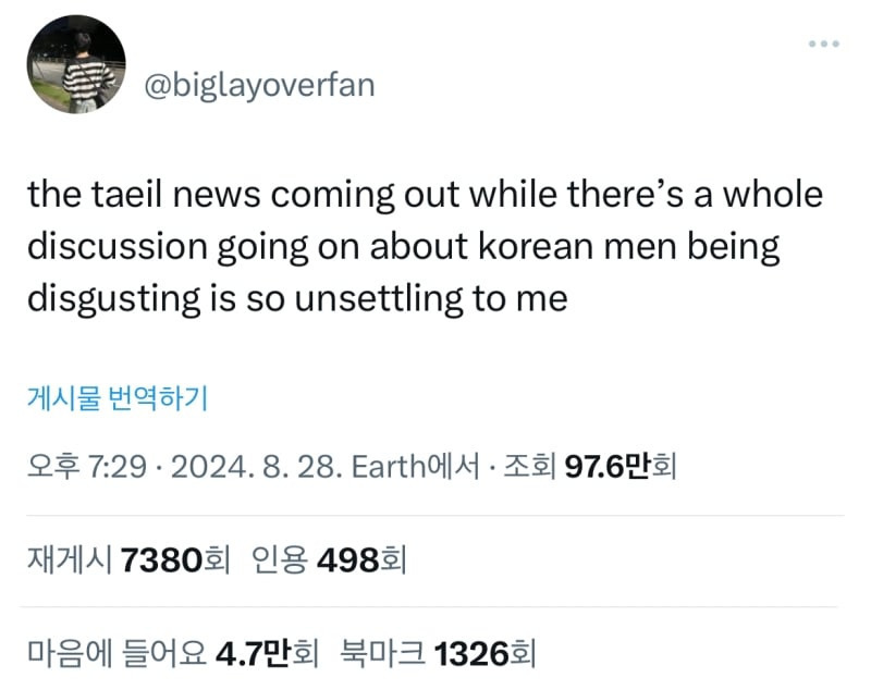 "한국 남성들이 얼마나 역겨운지 한창 논의가 진행되던 와중에 이런 태일이 뉴스까지 나온 게 진짜 환멸."