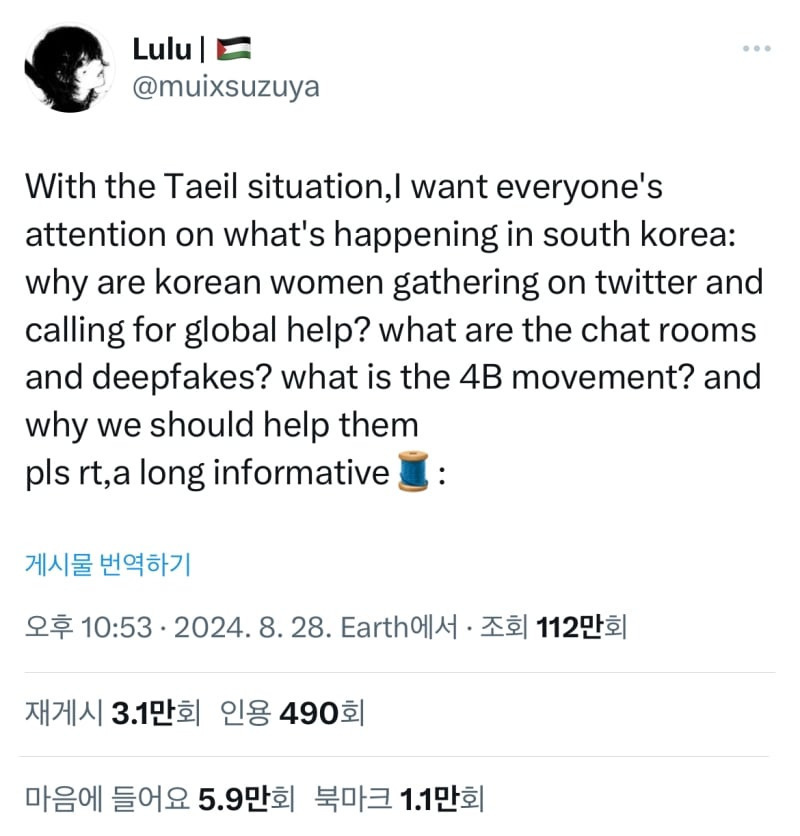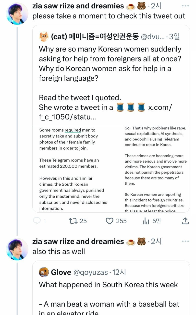 그와중에도 한국 여성들 목소리에 관심 가져달라고 다 타래에 공유해주고 있음.......