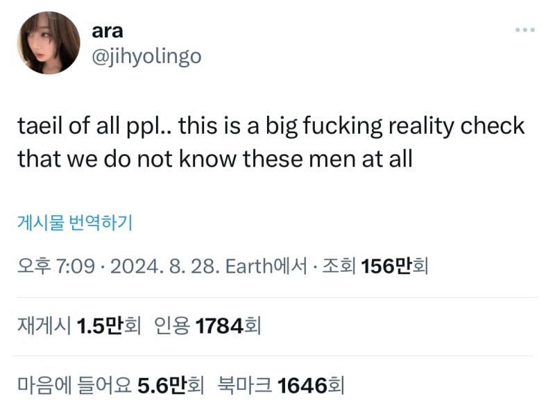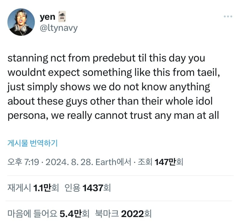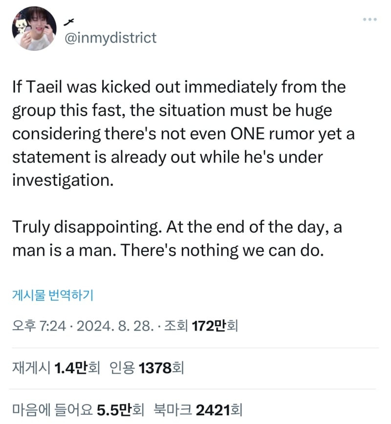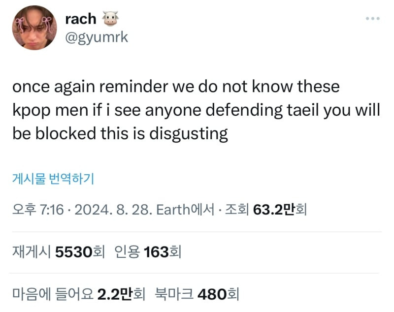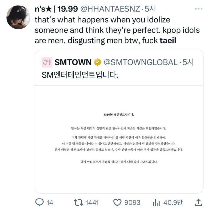 케이팝 아이돌도 결국 남자일 뿐이고, 역겨운 남자들일 뿐. 태일아 꺼져."