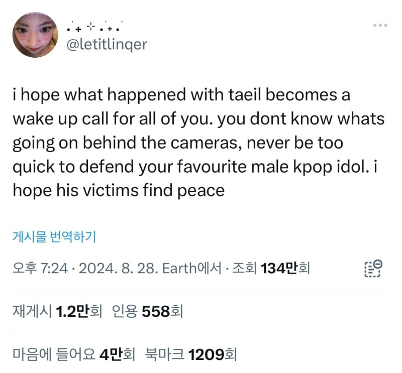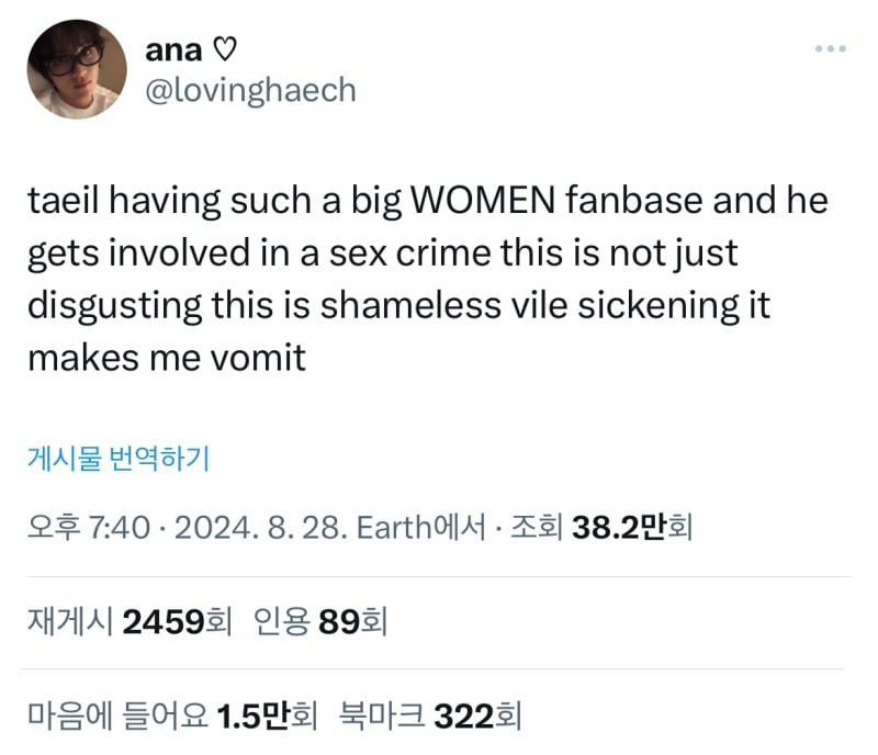 "여성 팬이 이렇게나 많았던 태일이 성범죄에 연루되다니, 이건 단순히 역겹다는 말로도 부족하다. 진짜 혐오스럽고 토가 나옴."