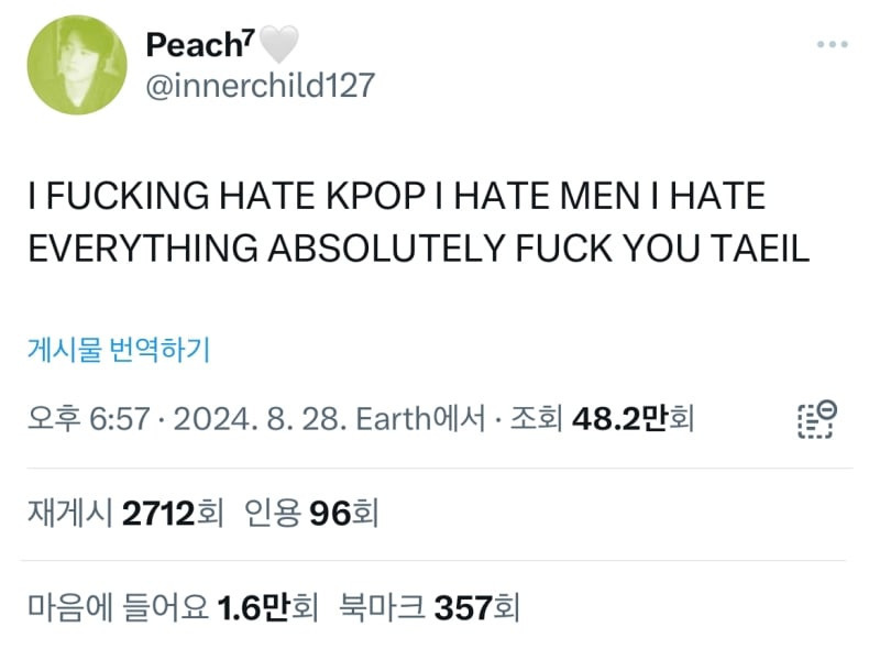 "나는 케이팝이 좆같고 남자도 싫고 모든 게 다 싫다. 진짜 다 꺼져버렸음 좋겠다."
