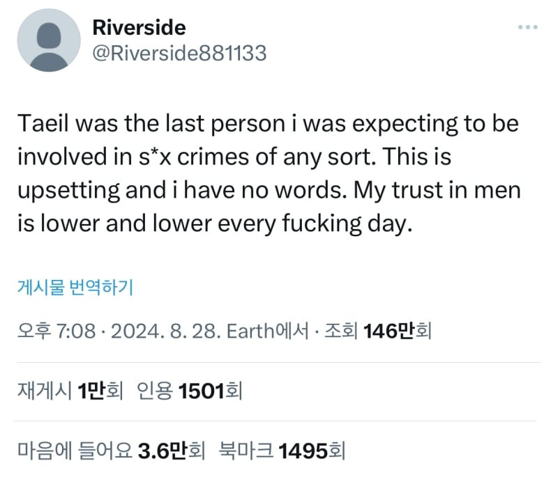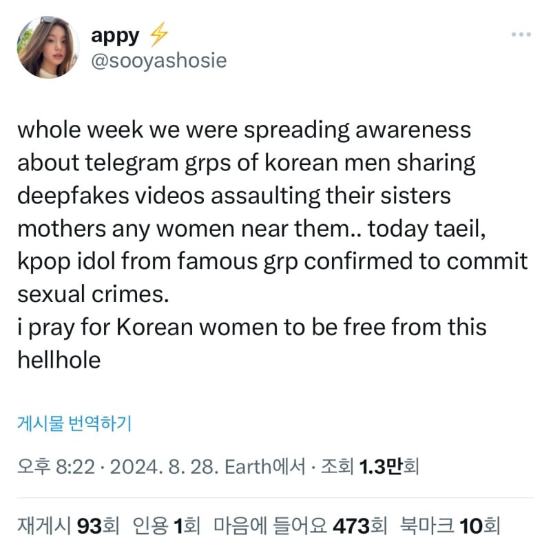 그리고 오늘은 유명한 케이팝 아이돌 그룹인 태일이 성범죄를 저지른 것으로 확인다. 난 한국 여성들이 그 지옥에서 벗어나길 기도한다."