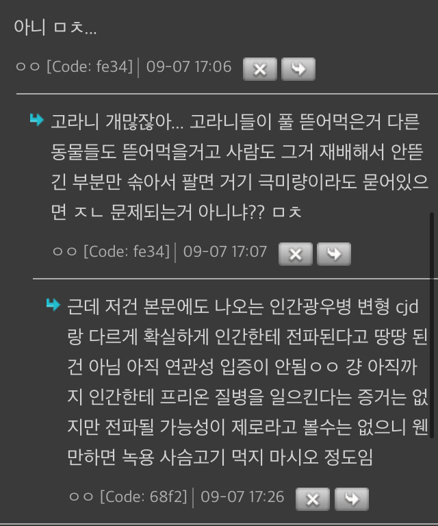 (프리온은 세균이나 바이러스같은 게 아니고 그냥 단백질인데 생물에 존나 유해한 단백질일 뿐이라서 그냥 접촉하지 않는 것 외에 방법이 없음)