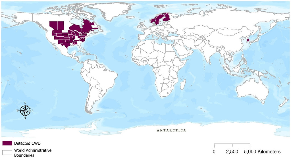 아시아에서 한국만 컬러링…CWD 매우위험 국가는 미국, 캐나다국이고 위험 국가는 한국인데 미국처럼 방역이나 처리를 하고 있지 않기 때문에 그냥 개인이 알아서 고라니랑 접촉 안하고 사슴고기, 녹용 안 먹는 게 최선임