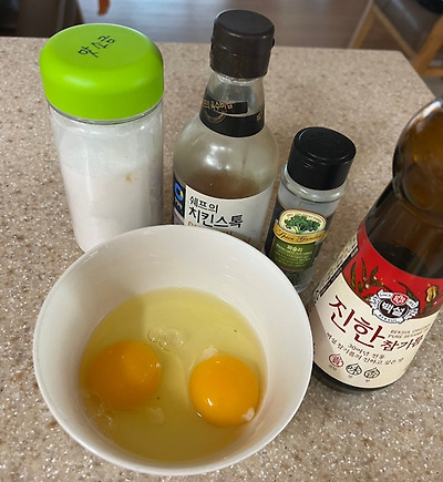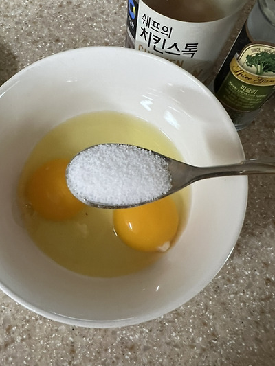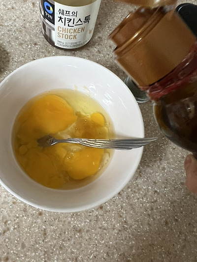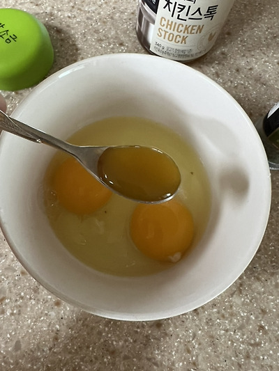 1. 준비물 : 소금 치킨스톡 (없으면 다시다/연두/멸치액젓 /참치액 다 ㄱㅊ 댓보고 참치액으로 만드니 치킨스톡보다 더 맛있더라고 ㅎ) 참기름 계란2알 물250ml (취향에따라 파슬리나 깨)