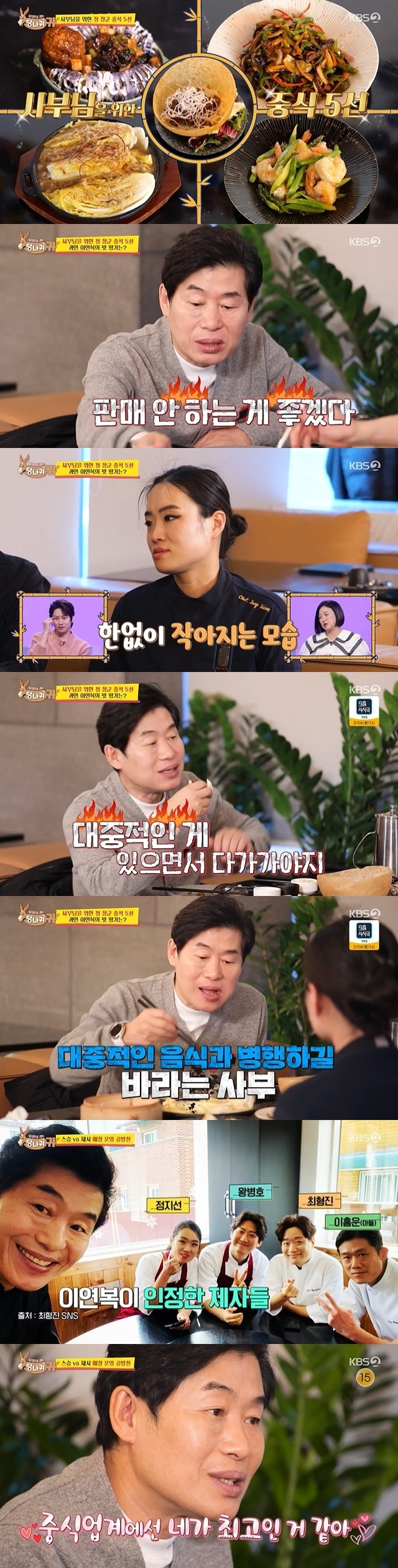 이연복은 "너 같이 연구 많이 하고 끊임없이 노력하는 사람 드물다"며 정지선의 노력을 높이 사 눈길을 끌었다.