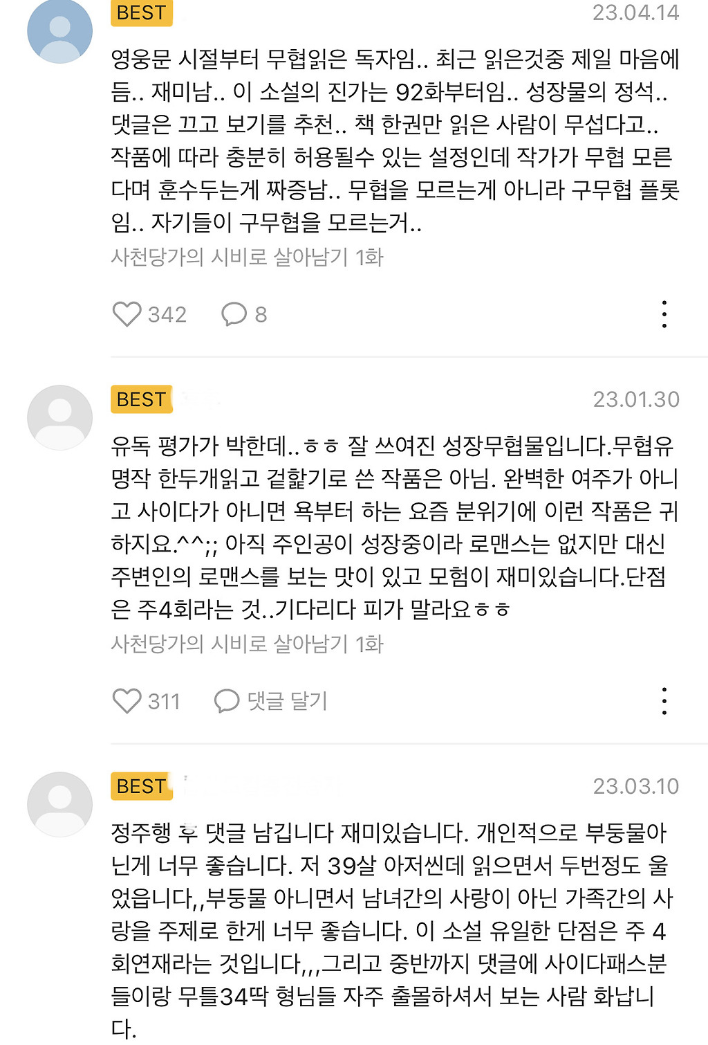 네이버에도 좋은 작품들이 많지만 타 플랫폼에도 재밌는 작품들이 정말 많아 근데 네이버가 워작 접근성이 좋아서 그런지 네이버, 시리즈 작품들만 보는 사람이 많더라고 이번 기회에 타 플랫폼에 있는 좋은 작품들이 많이 홍보되었으면 하기도 해서 추천글을 써봐