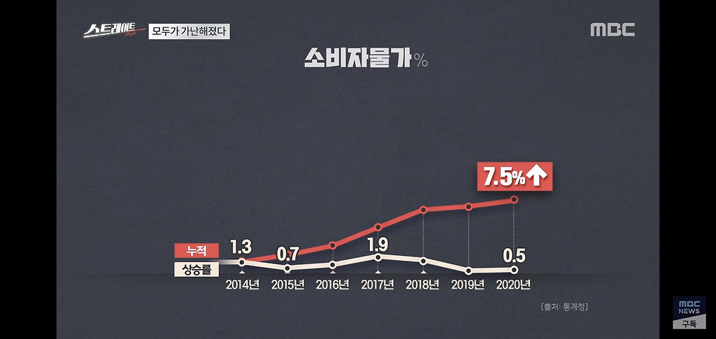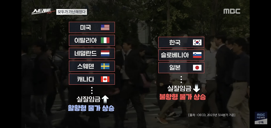 반면 한국은 물가만 오르고 임금은 제자리입니다.