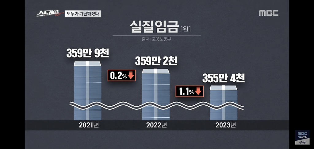 물가를 감안한 실질임금은 평균 355만 4천원으로 1년 전보다 오히려 1.1% 줄었습니다.