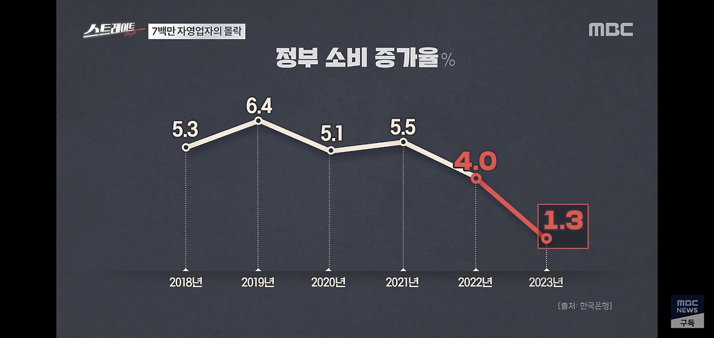 정부 소비 증가율은 2022년 4%에서 지난해 1.3%로 3분의 1토막이 났습니다.