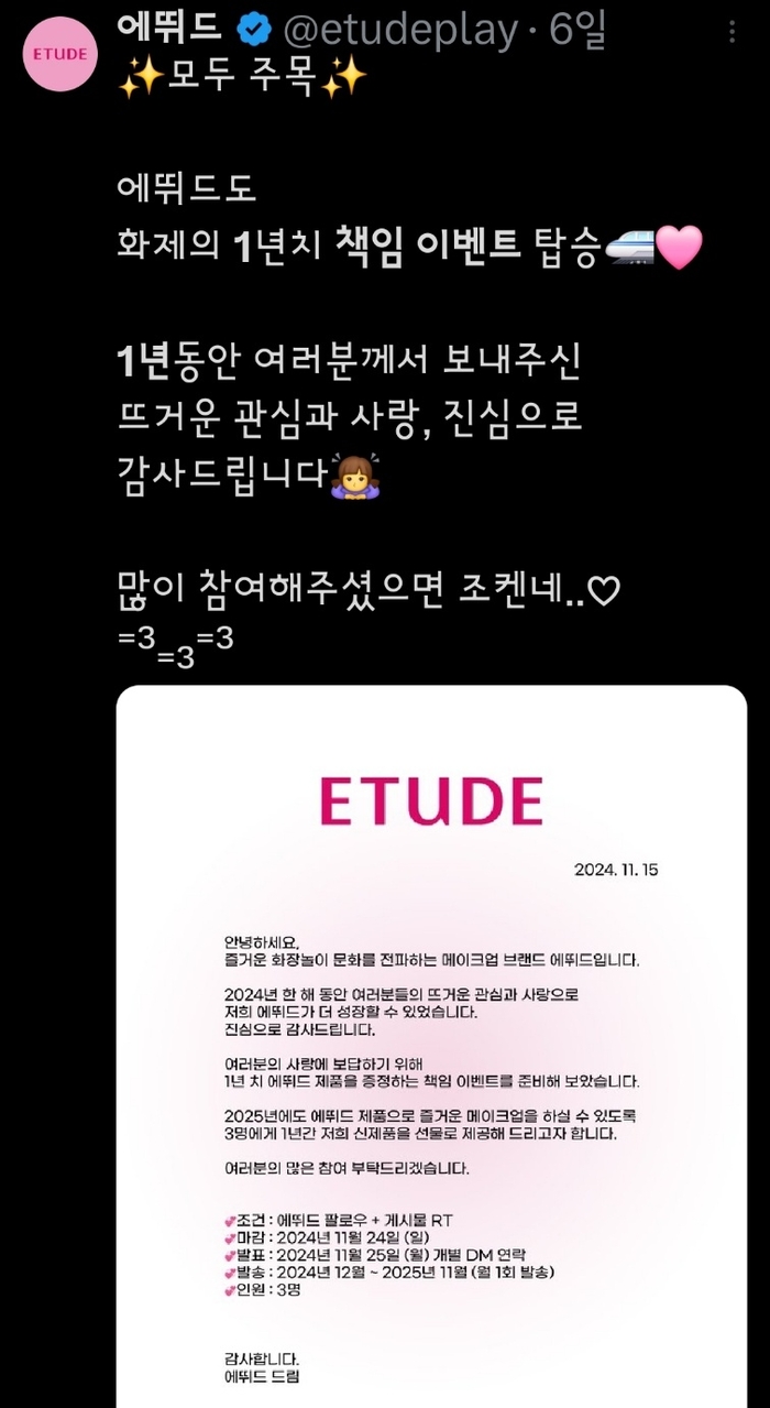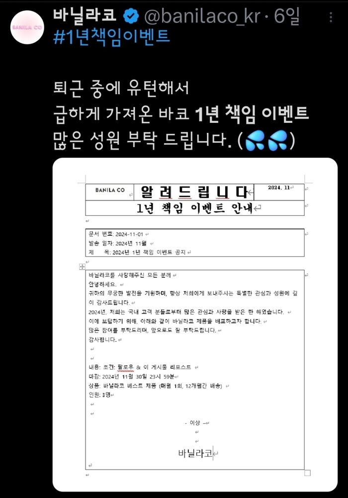 소셜네트워크서비스(SNS) 엑스(X, 前 트위터)에서 번지고 있는 ‘1년 책임 이벤트’가 뷰티업계 화제다.