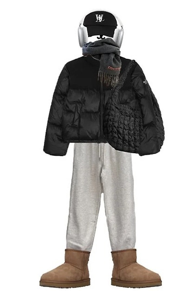 출처 : 여성시대 담곰담곰1. 노스페이스 눕시2. 스파오 파스텔 푸퍼3. 아크네스튜디오 머플러4. 어그 부츠보통은 이 중 한 두개씩 착용하는 경우가 많으며 종종 아래와 같이 다 착용한 사람들도 볼 수 있음+) 스웨이드 백+) 코스 구름백