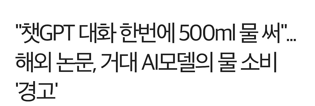 "GPT3 모델을 개발 훈련하는 데에 사용된 약 70만 리터의 깨끗한 물을 포함해서 계산하니 대화 한번에 500ml가 들어간 꼴이다.