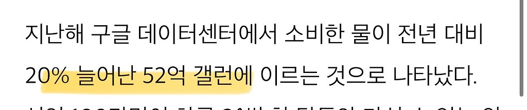 "2021년, 구글 글로벌 데이터센터는 43억 갤런의 물을 소비했으며 이것은 미국 남서부 29개의 골프장을 관개하고 유지하는데 필요한 물의 양이다."