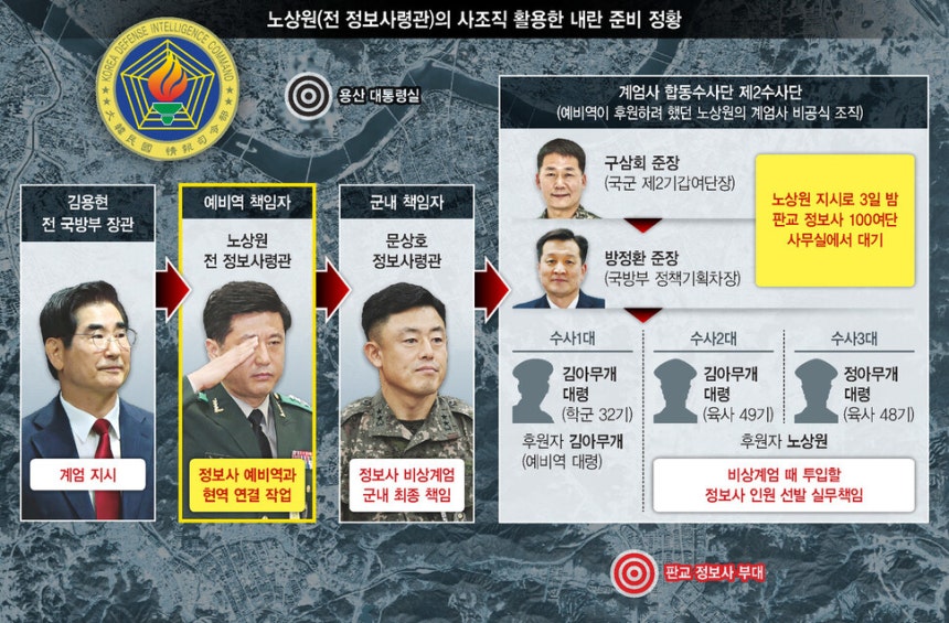 내란 당일인 12월3일 정보사는 철저히 이 비선 사조직을 중심으로 돌아갔다. 저녁 6시가 되기 전부터 수사2단 수뇌부 격인 구삼회 육군 제2기갑여단장(육사 50기), 방정환 국방부 정책기획차장(51기)을 비롯해 문상호 정보사령관, 김봉규 대령 등이 경기 성남시 분당구 판교 정보사 100여단에 모이기 시작했다. 문 사령관 등은 ㄱ 중령이 운전하는 승용차 편으로 100여단 위병소를 통과했다.