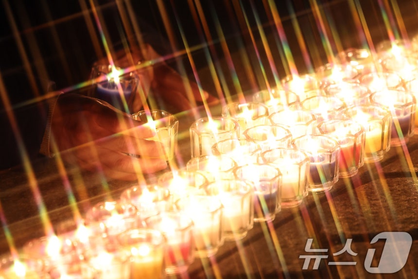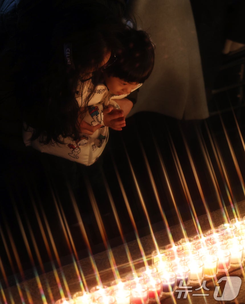 (서울=뉴스1) 구윤성 기자 = 크리스마스 이브인 24일 오후 서울 중구 명동성당에서 한 어린이가 소원을 빌며 촛불봉헌을 하고 있다. 2024.12.24/뉴스1