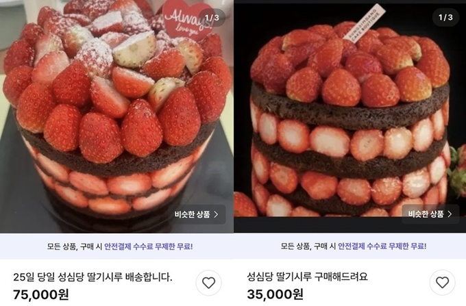대전 지역 유명 빵집 성심당의 크리스마스 시즌 대표 케이크 ‘딸기시루’를 대리구매 해준다는 글이 각종 중고거래 플랫폼에서 최근 이어졌다. 25일 각종 중고거래 플랫폼과 커뮤니티 등에 따르면 일종의 수고비까지 얹은 ‘딸기시루’ 케이크 대리구매 게시물이 거듭 눈에 띄는데, 지난해와 상황이 다르지 않다.