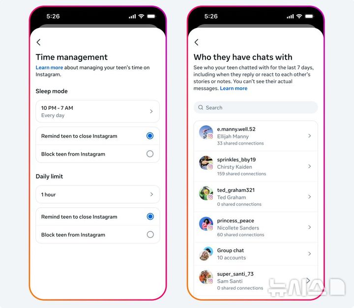 [서울=뉴시스] 19일 메타에 따르면 인스타그램은 지난 17일(현지시각)부터 미국, 영국, 캐나다, 호주 등에서 18세 미만 청소년 사용자를 '10대 계정(Teen Accounts)'으로 전환하는 절차를 시작했다. 사진은 부모가 자녀 계정을 관리·감독하는 기능. 자녀의 인스타그램 사용시간을 설정할 수 있으며 자녀가 누구와 대화했는지 알 수 있다. (사진=메타 블로그 캡처)