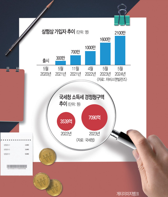 삼쩜삼의 성장으로 종합소득세 환급에 대한 관심이 높아지면서 관련 시장은 최근 몇 년간 급속도로 팽창했다. 지난해 기준 삼쩜삼의 누적 가입자는 2000만명을 넘어섰다. 그러자 후속주자들도 속속 등장했다. 토스는 지난해 5월 세금 환급 서비스 세이브잇 운영사 택사스소프트를 180억원에 인수해 토스인컴을 출범시켰다. 카카오뱅크도 개인사업자 세금 신고·조회 서비스 ‘SSEM’ 운영사 널리소프트와 제휴를 맺고 관련 서비스를 제공 중이다. 업계는 환급액으로만 따져도 시장 규모가 3조원에 달할 것으로 추정한다.