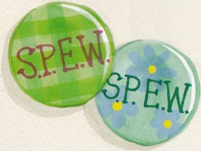 그녀는 상자뚜껑을 열고 안에 들어있는 것을 보여주었다. 상자 속에는 50개쯤 되는 뱃지가 들어있었다.색깔은 모두 달랐지만 하나같이 S.P.E.W라는 글자가 적혀 있었다.