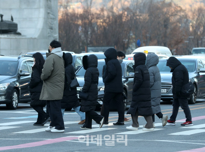 [이데일리 김태형 기자] 올겨울 첫 한파주의보가 발효된 9일 오전 서울 광화문네거리에서 시민들이 두꺼운 옷차림으로 출근길을 재촉하고 있다.