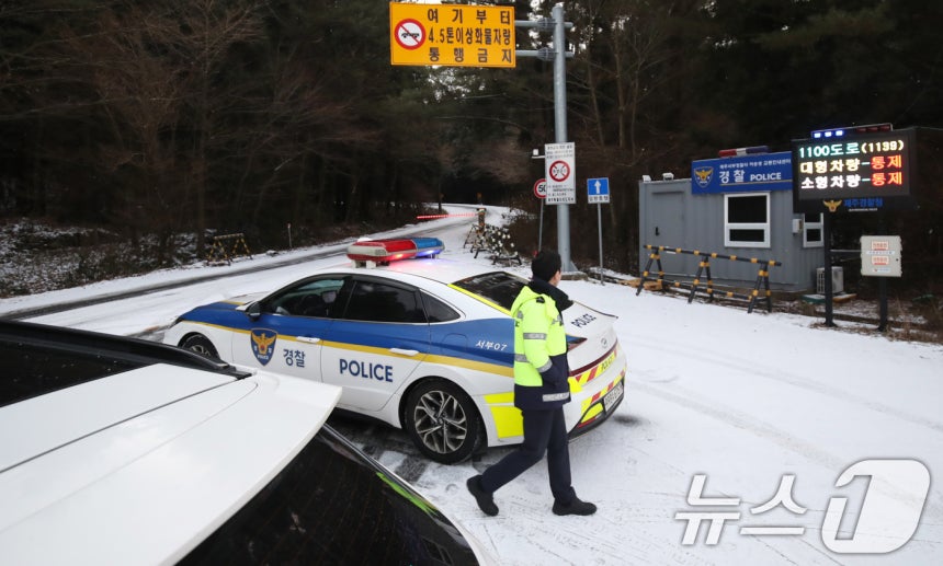 (제주=뉴스1) 오현지 기자 = 제주 산지에 대설특보가 내려진 9일 오전 1100도로에서 차량 통행이 통제되고 있다. 2025.1.9/뉴스1