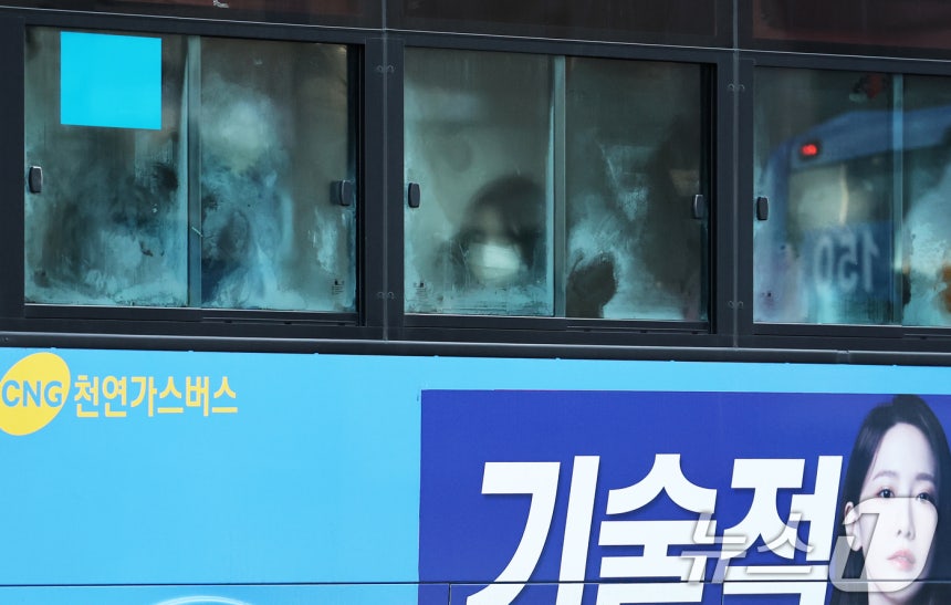 (서울=뉴스1) 오대일 기자 = 서울을 비롯한 수도권 전역에 올 겨울 첫 한파주의보가 발효된 9일 오전 서울 종로구 광화문네거리를 지나는 출근버스 차창에 김이 서려 있다. 2025.1.9/뉴스1
