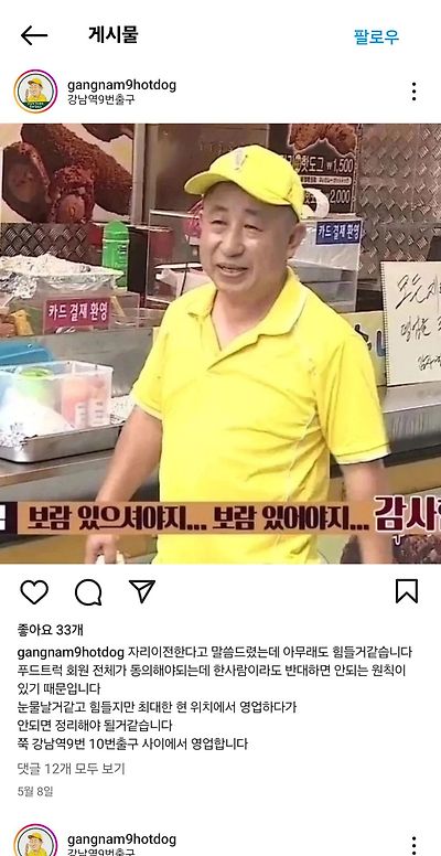 출처: 여성시대 투툽백종원의 푸드트럭 핫도그집임사장님 돌아가시고 아들분이 이어서 하고있는데여기 위치가 사람들 잘 안 다녀서 장사 안되시나봐존맛에 가격도 엄청 싸고 핫도그 1개라도 카드결제 환영한다고 계속 말하시는데너무 안타까움 없어지면 안되는데 말이죠...😢//위치가 진짜 안좋나봄 어제 인스스도 손님 없어서 일찍 들어가신다고🥹https://www.instagram.com/gangnam9hotdog