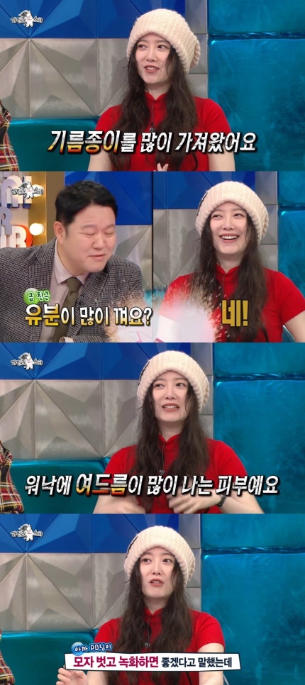 이날 구혜선은 ‘라스’ 촬영을 위해 단단히 준비해온 것이 있다고 밝혔다. 그 정체는 다름아닌 기름종이. 구혜선은 “기름종이를 많이 가져왔다”면서, 유분이 많이 끼느냐는 김구라의 물음에 “그렇다”고 답했다.
