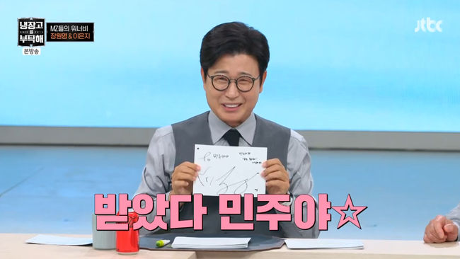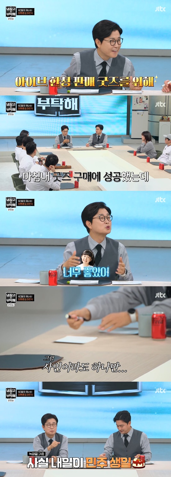 김성주는 "딸이 새벽 5시에 집을 나갔다. 아이브 한정 굿즈를 사러 나갔더라. 산 시간이 오후 5시였다. 정말 좋았다고 하더라"라며 즉석에서 내일이 생일인 딸 민주를 위해 사인을 받기도.