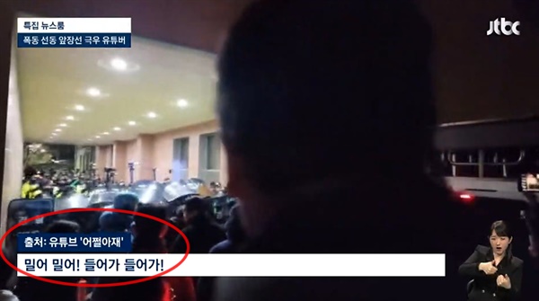 | ▲ JTBC 뉴스룸은 19일 "폭동 생중계하며 적극 지시...극우 유튜버들은 ‘증거 인멸 중’”이라는 제목의 뉴스 영상에서 서울서부지법 폭동 상황을 생중계한 보수 성향 유튜버들과 함께 진보 성향으로 분류되는 '어쩔아재' 유튜버 영상도 포함시켰고 현장음에 “밀어 밀어! 들어가 들어가!”라는 자막을 넣어 마치 해당 유튜버가 발언한 것처럼 보도했다. |