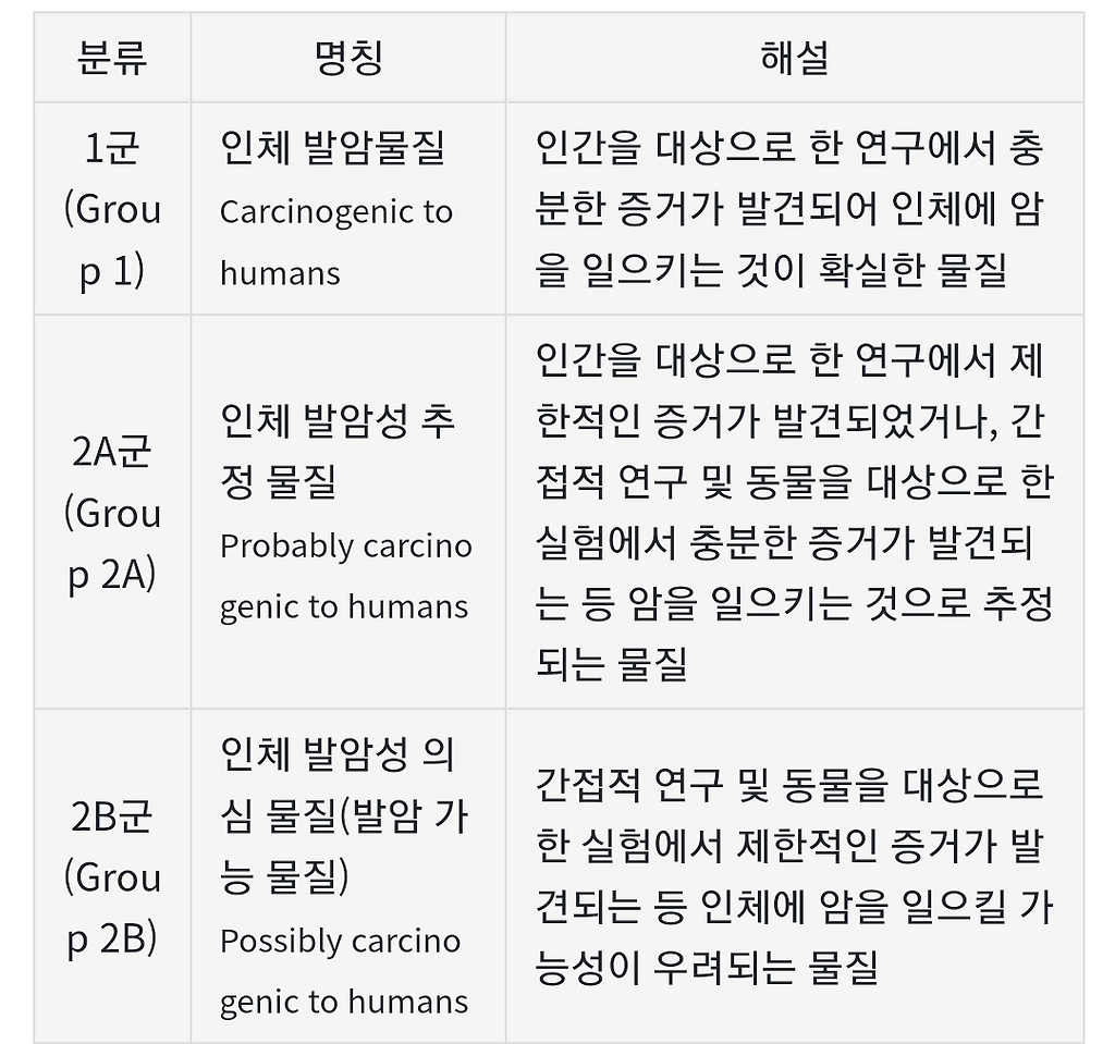 1군은 연구 증거가 충분하고 증명된 확실한 발암물질이라는 의미(인과성이 확실하게 증명됐다)이지