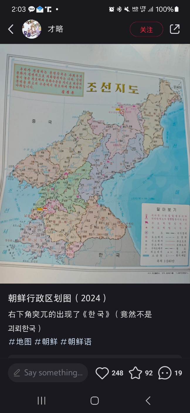 중국 SNS 샤오홍슈에 올라온 북한의 최근 한반도 지도 '조선전도'에는 남한 지역이 회색으로 처리되어 있고 지역 이름도 '한국'이라고 적혀 있습니다.