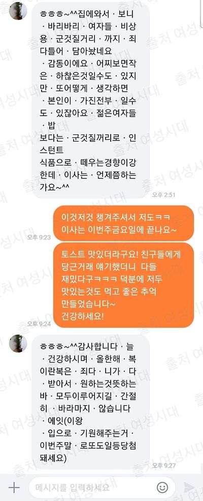 마침표도 아니고 천지인 ㆍ을 띄어쓰기로 쓰시더니 유자차랑 토스트까지 주시겠다는거 ㅋㅋㅋㅋㅋ