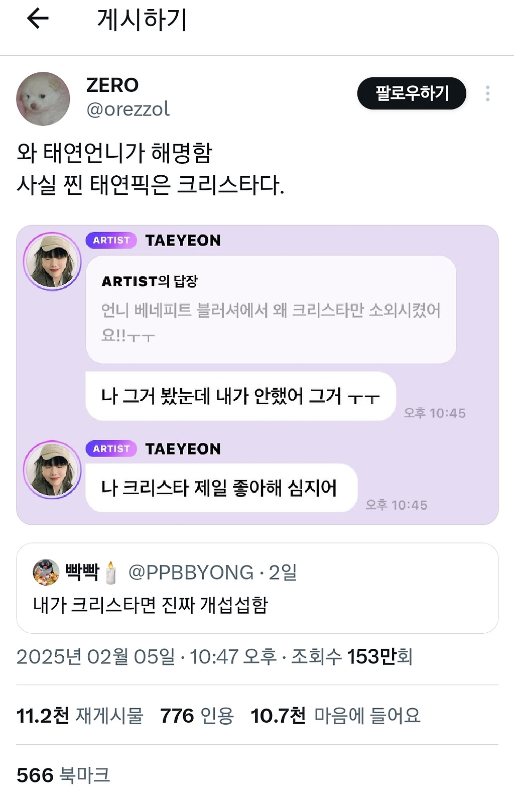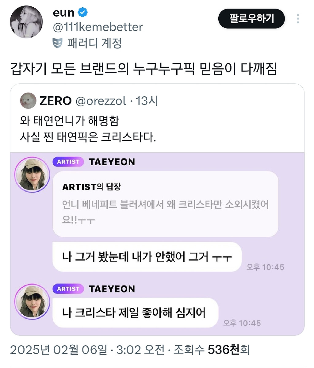 출처: 여성시대 거러거러걸걸, 트위터 링크(https://x.com/PPBBYONG/status/1886354775916302583?s=19