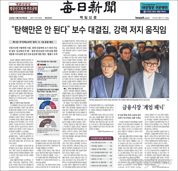| ▲ 지난해 12월 5일자 매일신문 1면에 <'탄핵은 안 된다' 보수 대결집, 강력 저지 움직임> 기사를 배치했다. 매일신문 기자들은 이 기사를 예로 들어 편파적인 보도라고 비판하고 있다. |
