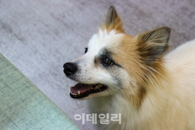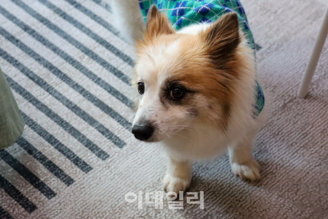 | | 푸딩이 지난 13일 경기 하남시 새 가족의 집에서 보호자들을 올려다보고 있다. (사진=이재은 기자) |