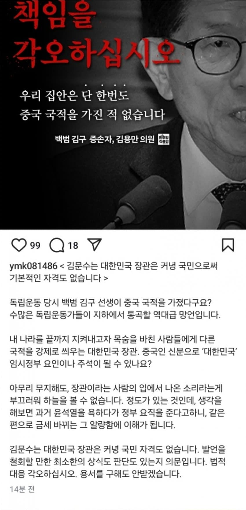 김구 증손자 김용만 더불어민주당 의원의 페북임