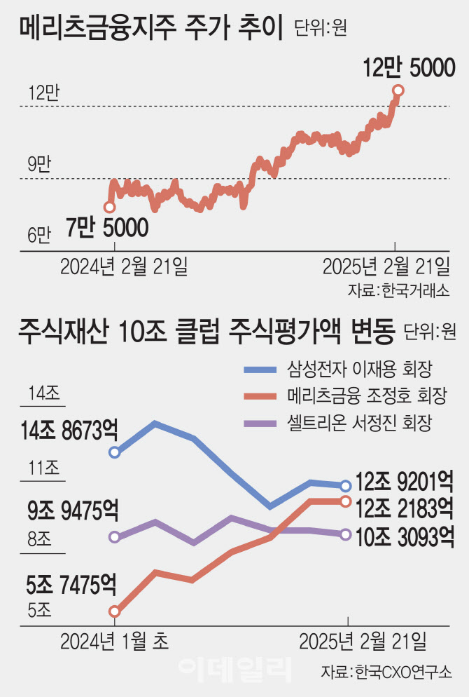조정호 메리츠금융지주 회장이 국내 주식부자 1위인 이재용 삼성전자 회장과의 주식평가액 격차를 5%대까지 바짝 좁혔습니다.