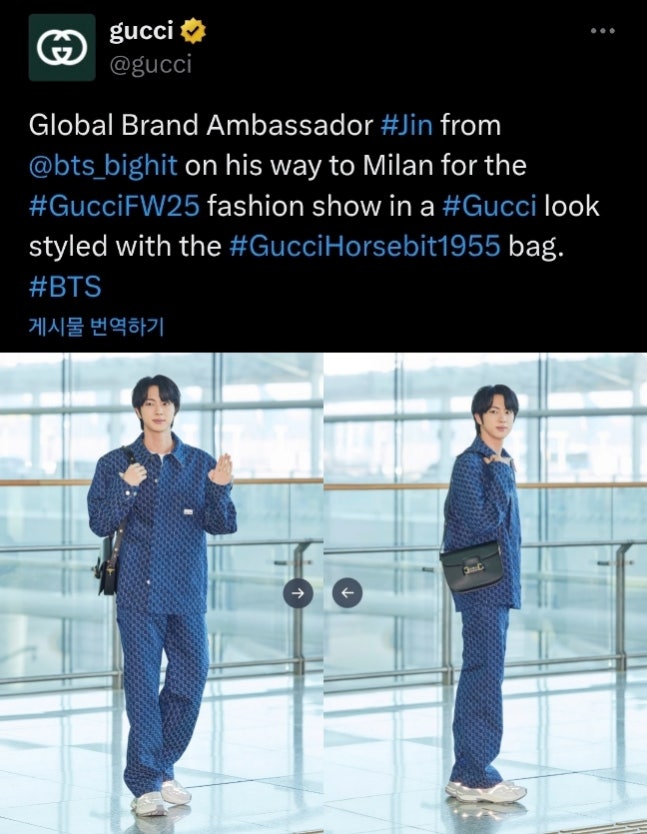 구찌는 X(옛 트위터) 등 공식 SNS를 통해 완벽한 비주얼을 가진 진의 출국 사진과 함께 "Gucci FW25 패션쇼를 위해 밀라노로 가는 글로벌 브랜드 앰버서더 진이 구찌의 룩을 입었습니다"라는 글을 남기며 '구찌의 얼굴' 진을 향한 애정을 드러냈다.